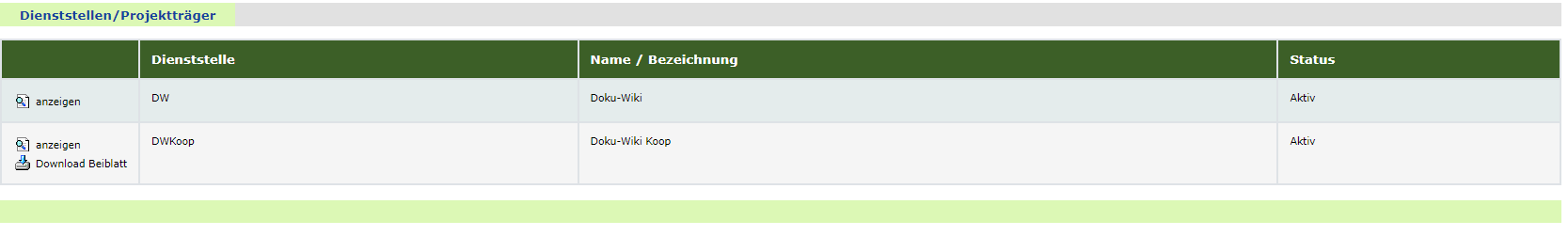 Download Beiblatt, wobei die bereits erfassten Organisationsstammdaten dynamisch vorausgefüllt werden. Je nach Projekttyp muss das eine oder andere Beiblatt von den Kooperationspartner*innen oder Partner-Dienststellen fertig ausgefüllt und unterzeichnet in der Registerkarte Anlagen als
