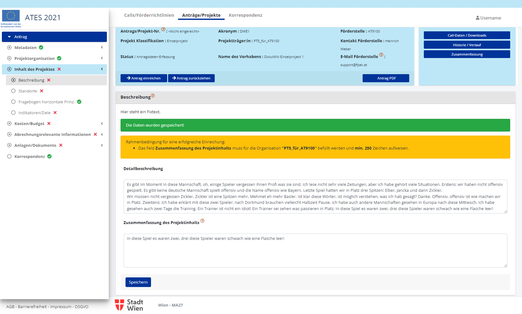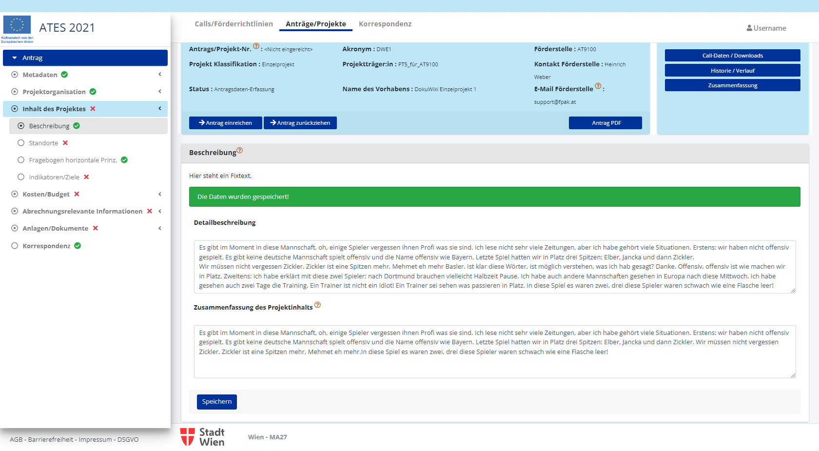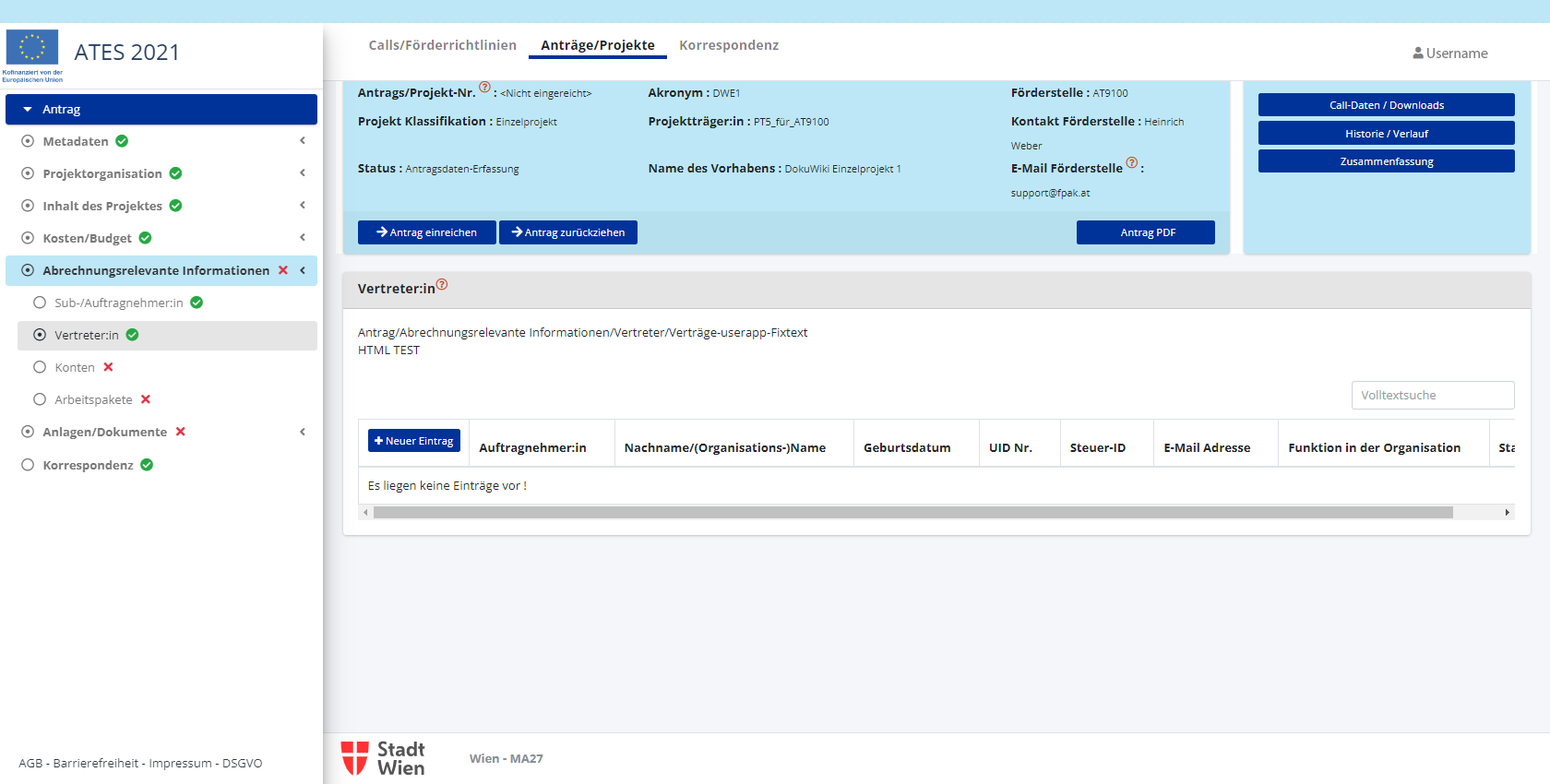 Die Navigation im Antrag erfolgt auf der linken Seite. Beim öffnen eines neuen Projektes werden fehlende Daten mit Pflichtfeldern mit einem