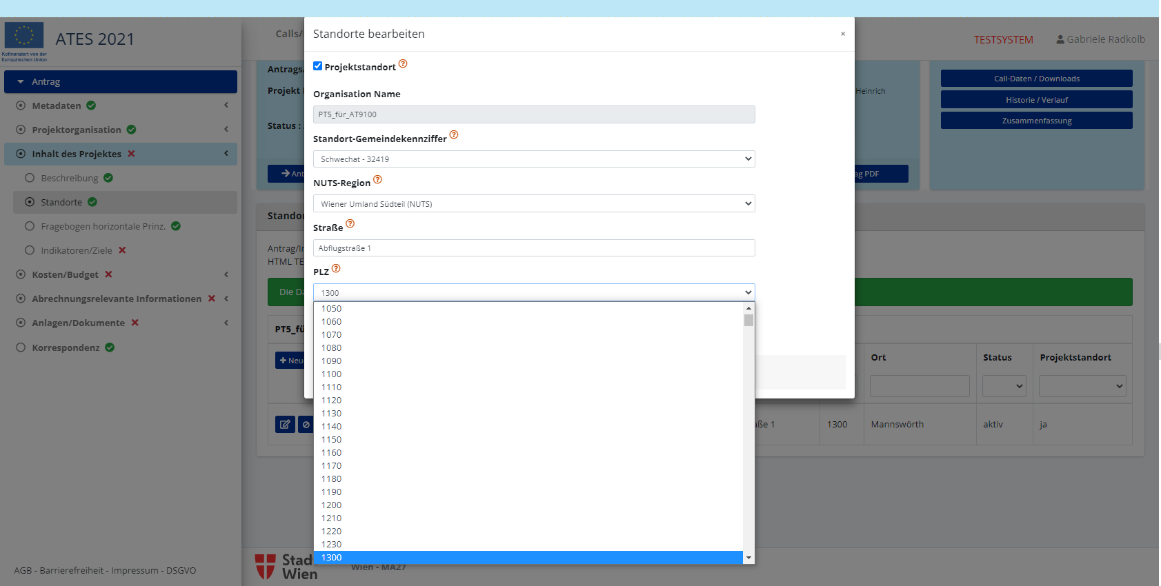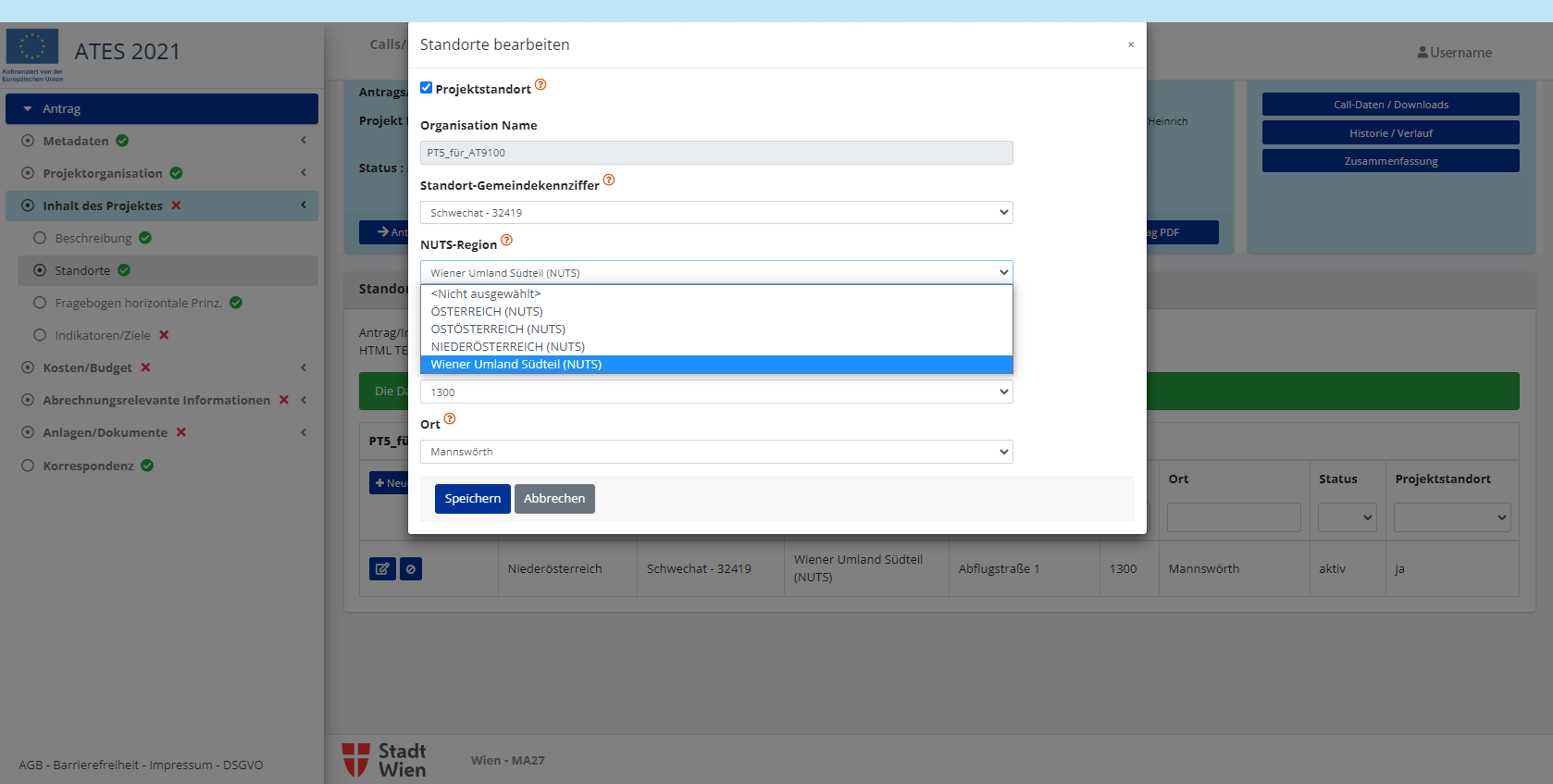 Die in der Übersicht der Standorte angezeigte Art des Gebietes wird automatisch ausgefüllt. Nachdem ein Standort eigegeben wurde ist es möglich diesen zu: