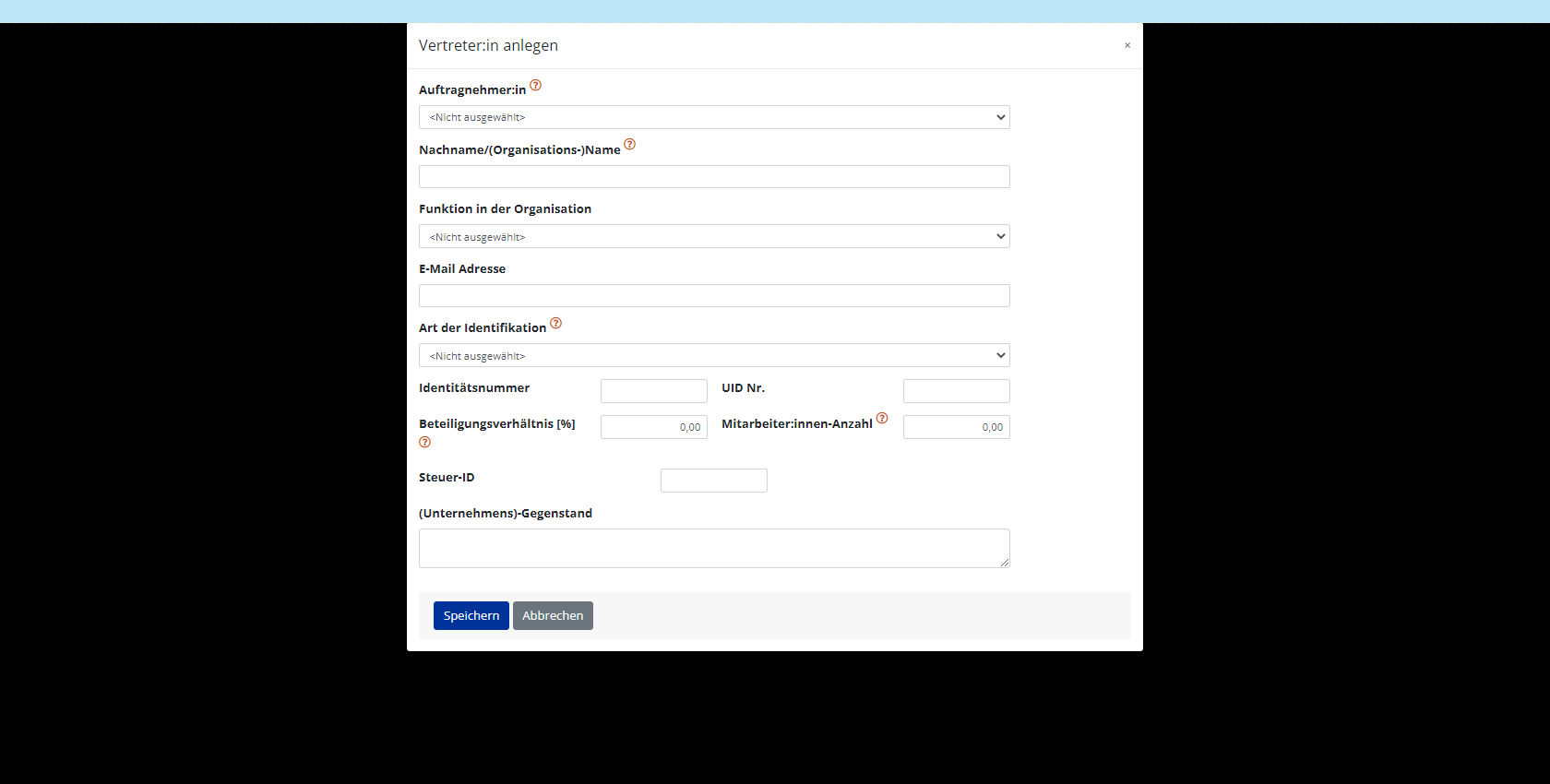 Die antragstellende Person einer Projektorganisation bzw. der führenden Organisation in einem Partnerprojekt wird mit dem ersten Login automatisch als Projektleiter*in, Ersteller*in und Editor*in angelegt. Für die Antragseinreichung muss zumindest noch eine Person als rechtsverbindliche*r Vertreter*in dem Projekt zugeordnet werden, welche keine registrierte Person sein muss. Weitere Personen können auch erst nach der Antragsgenehmigung nominiert werden. Personeneintragungen können durch die Rollen Ersteller*in, Projektleiter*in (der führenden Organisation in einem Partnerprojekt) und Abrechner*in erfolgen.