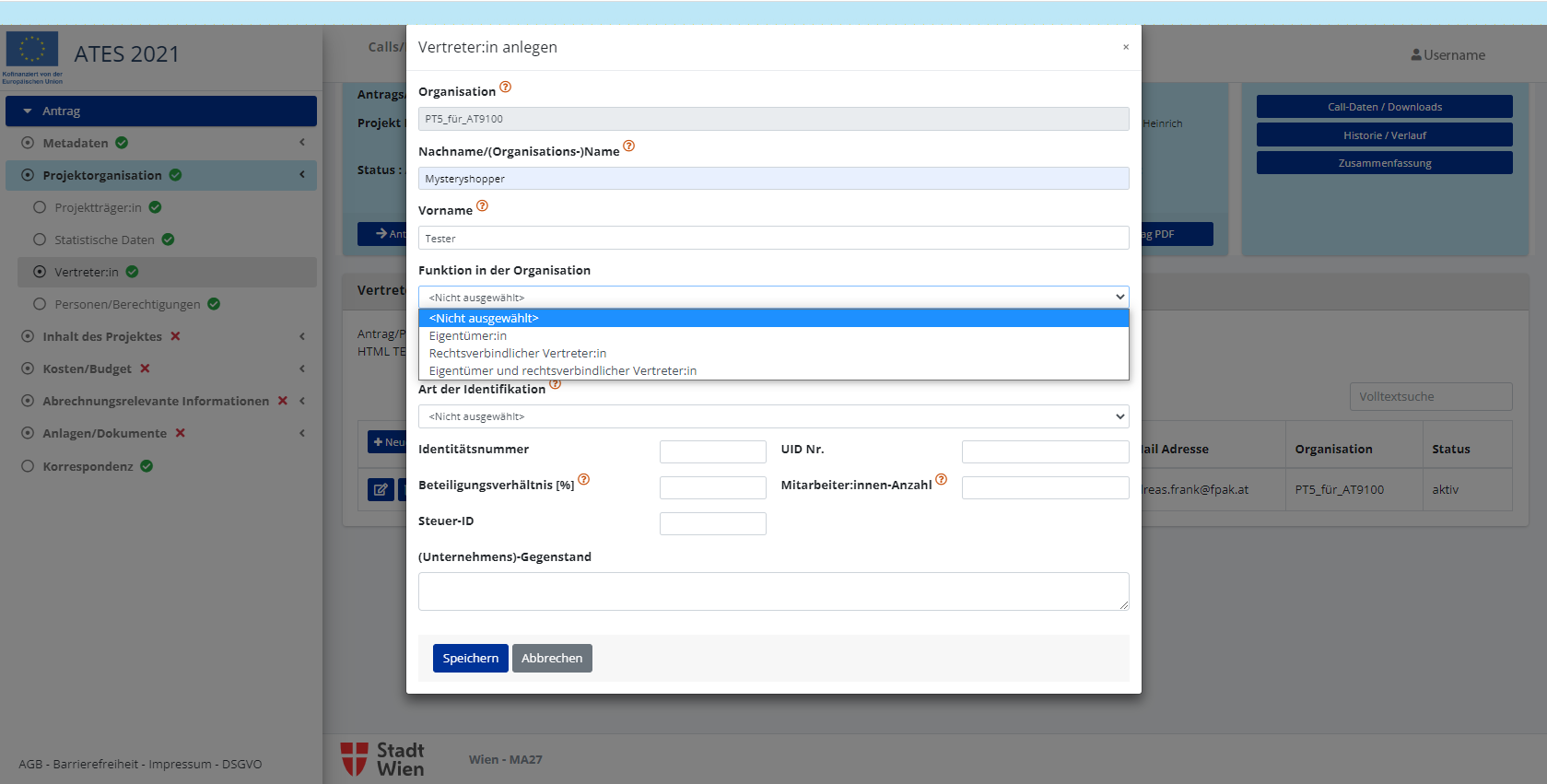 In der Rolle Projektleitung ist es möglich festzulegen wer als Kontaktperson zur Förderstelle agiert.