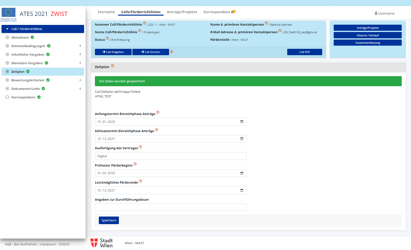 Nach dem Speichern ist es möglich die den Call/die Förderrichtlinie einzurichten. Erledigte Punkte werden mit einem