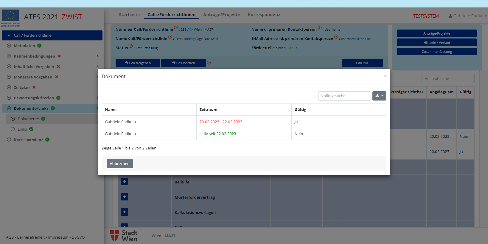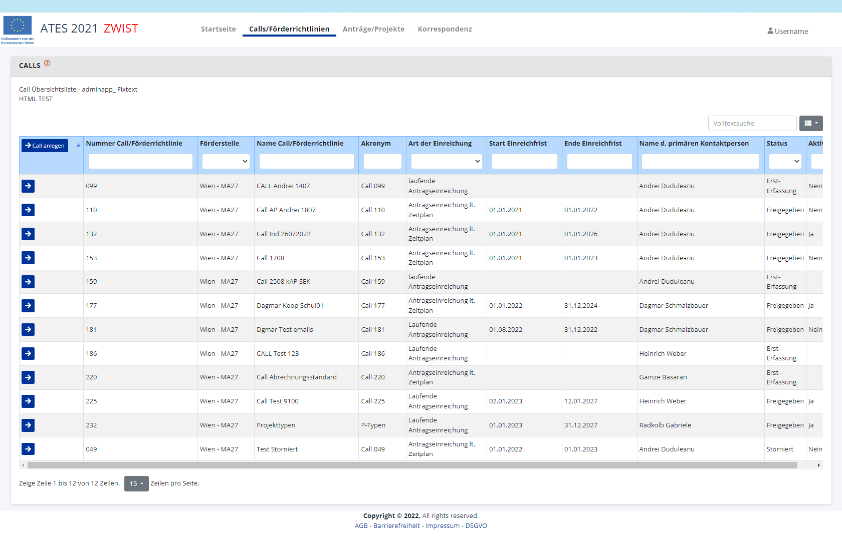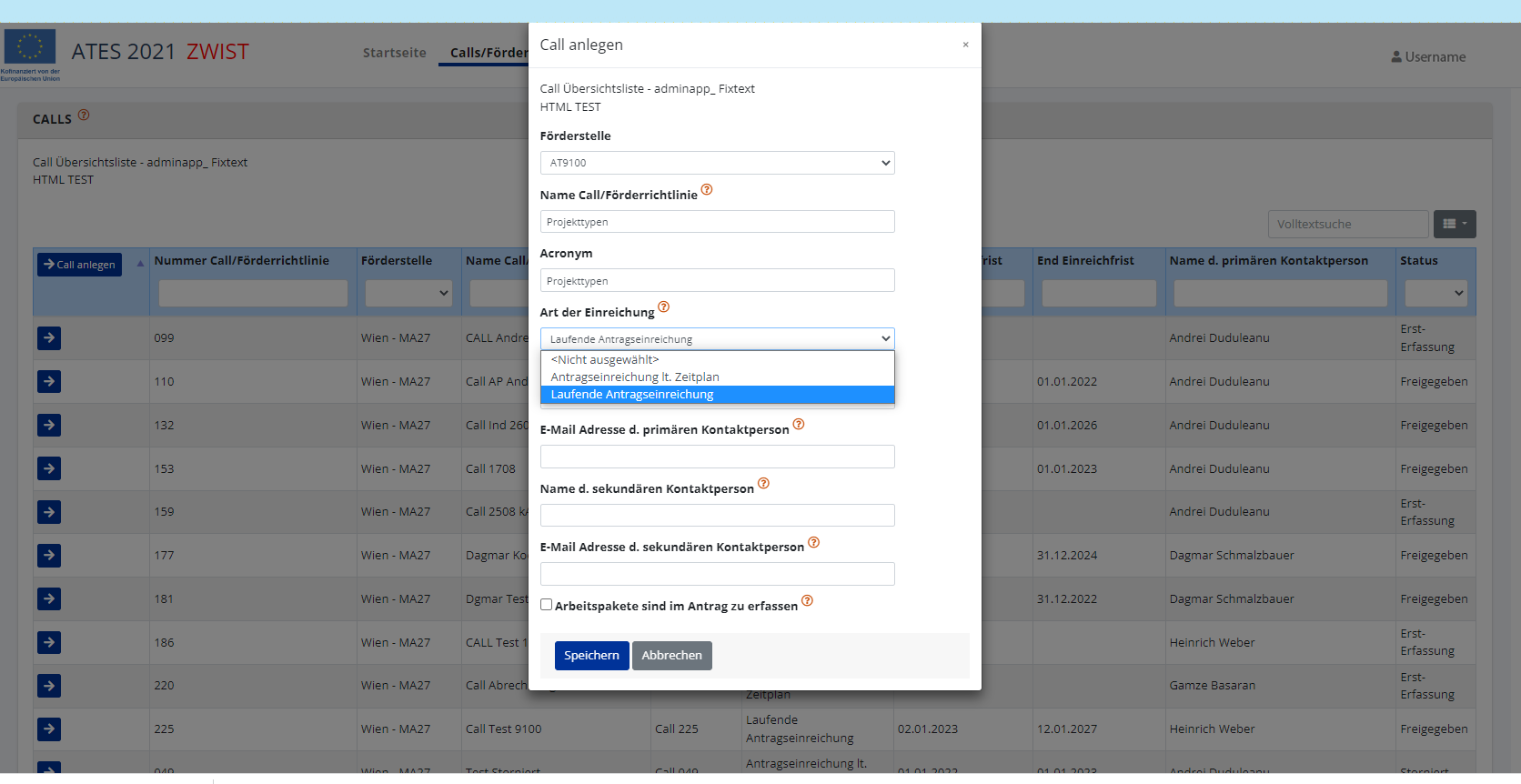 können in diesem Bereich neue Calls/Förderrichtlinien angelegt werden.