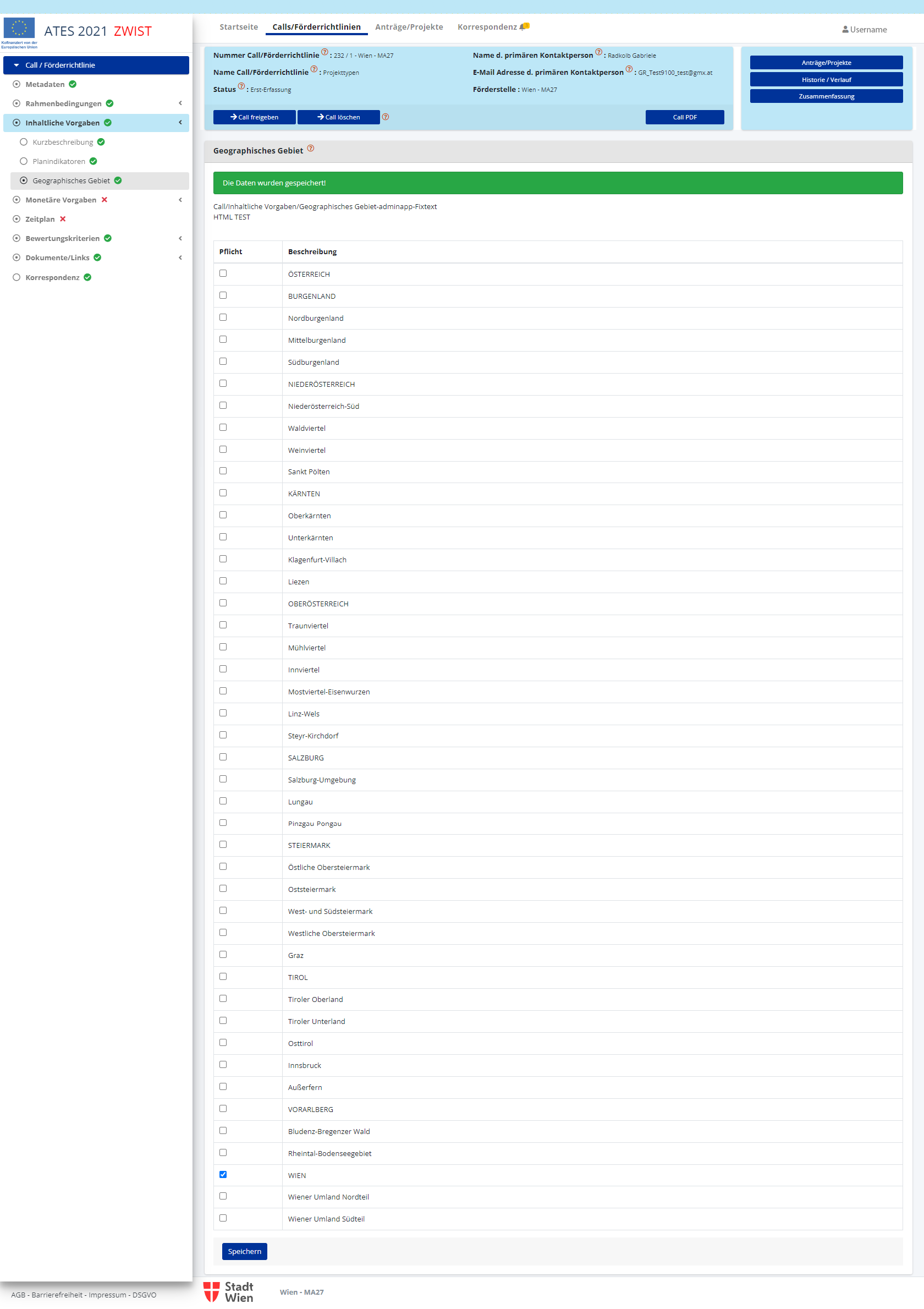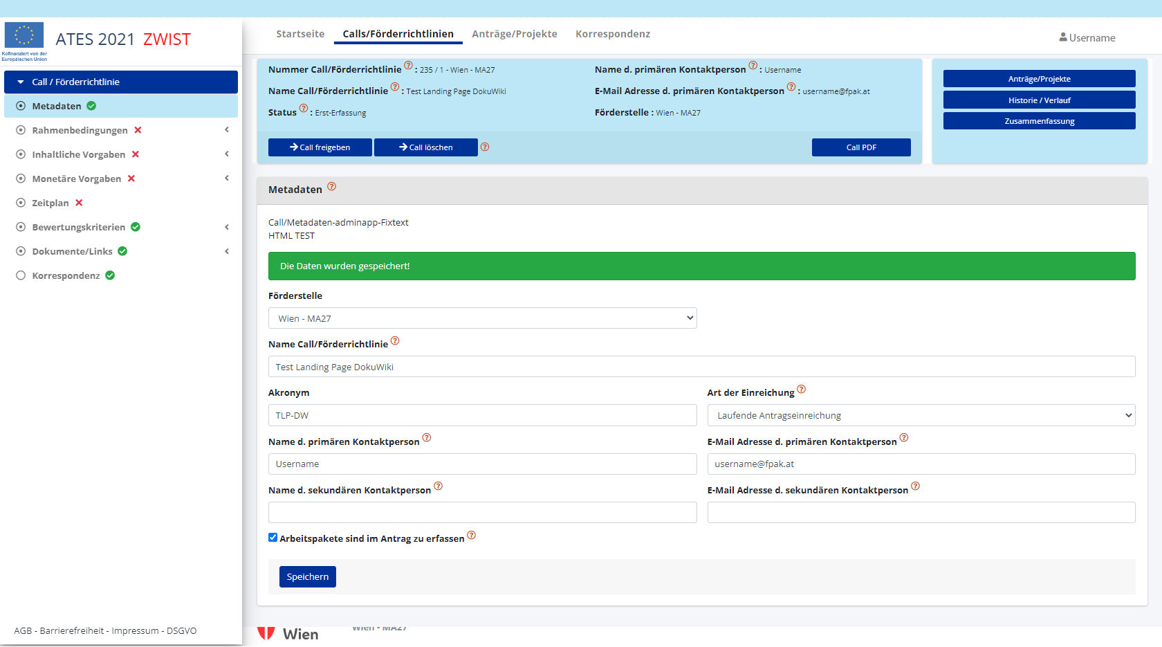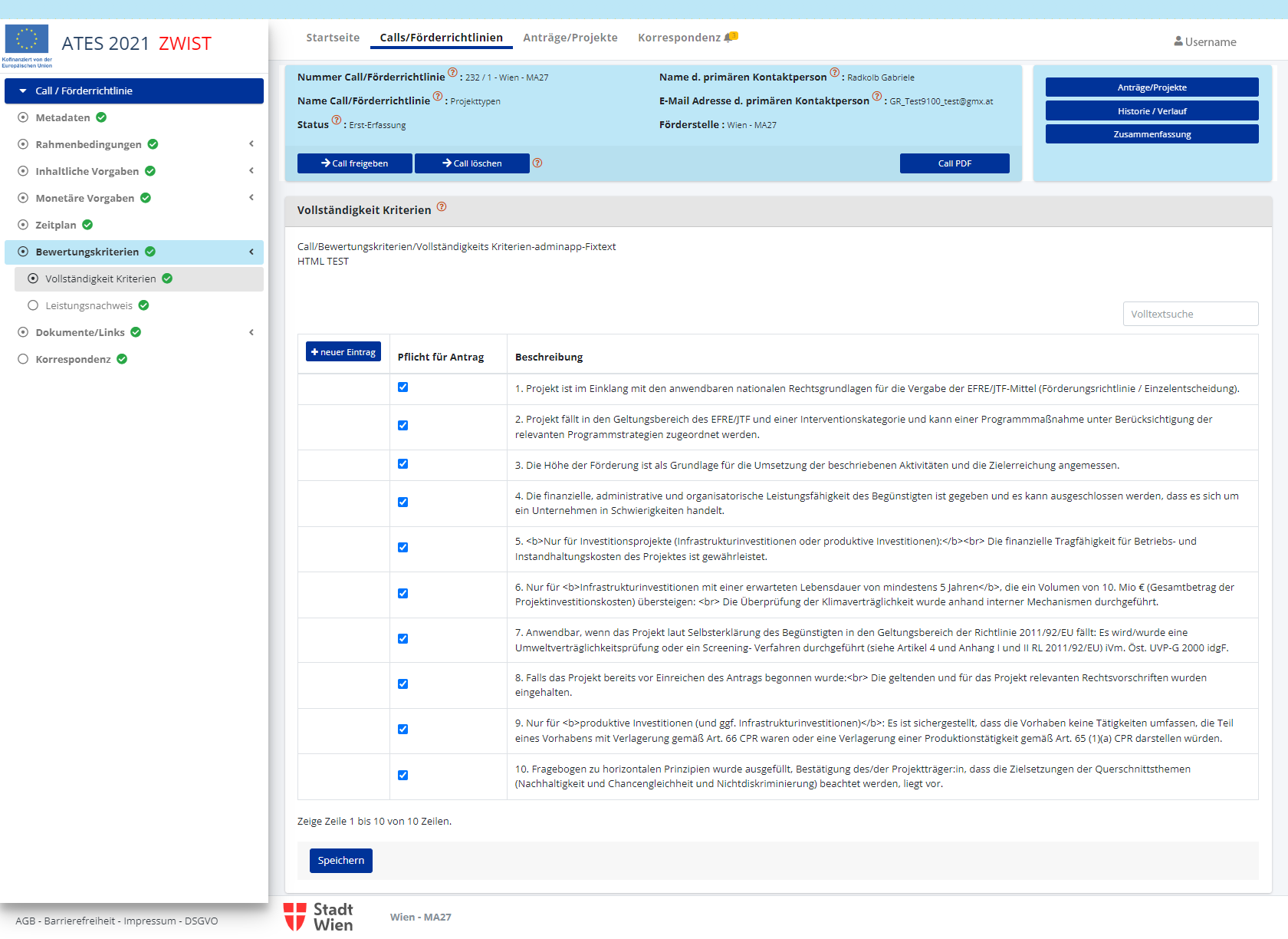 Nach dem Speichern ist es möglich die den Call/die Förderrichtlinie einzurichten. Erledigte Punkte werden mit einem
