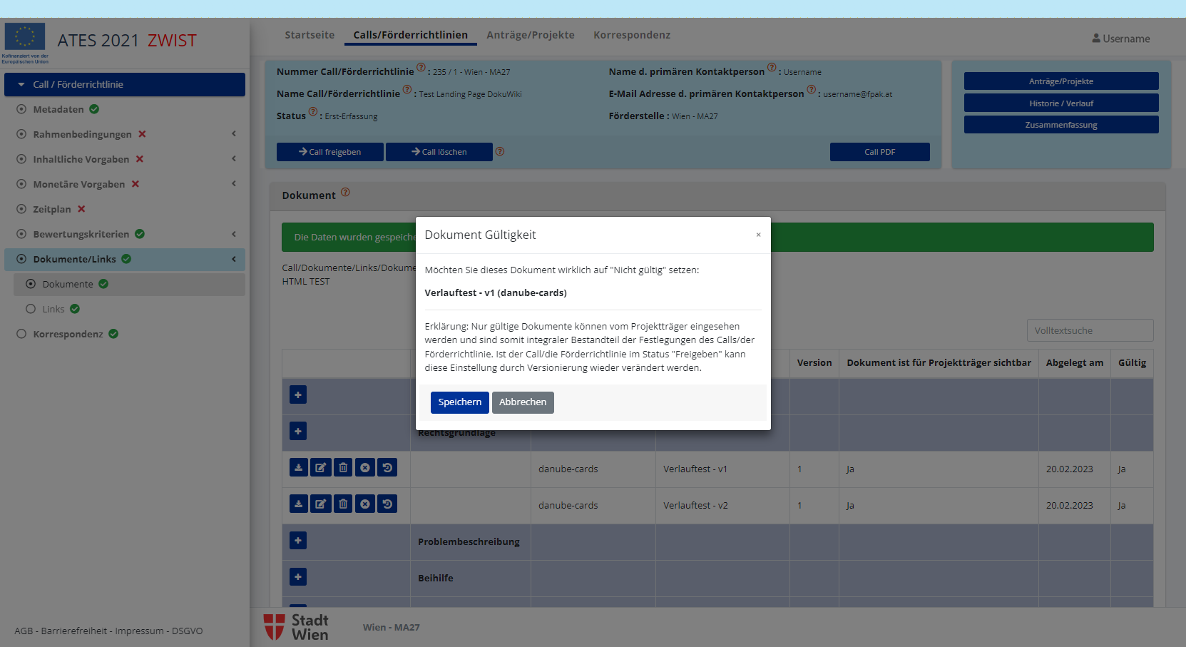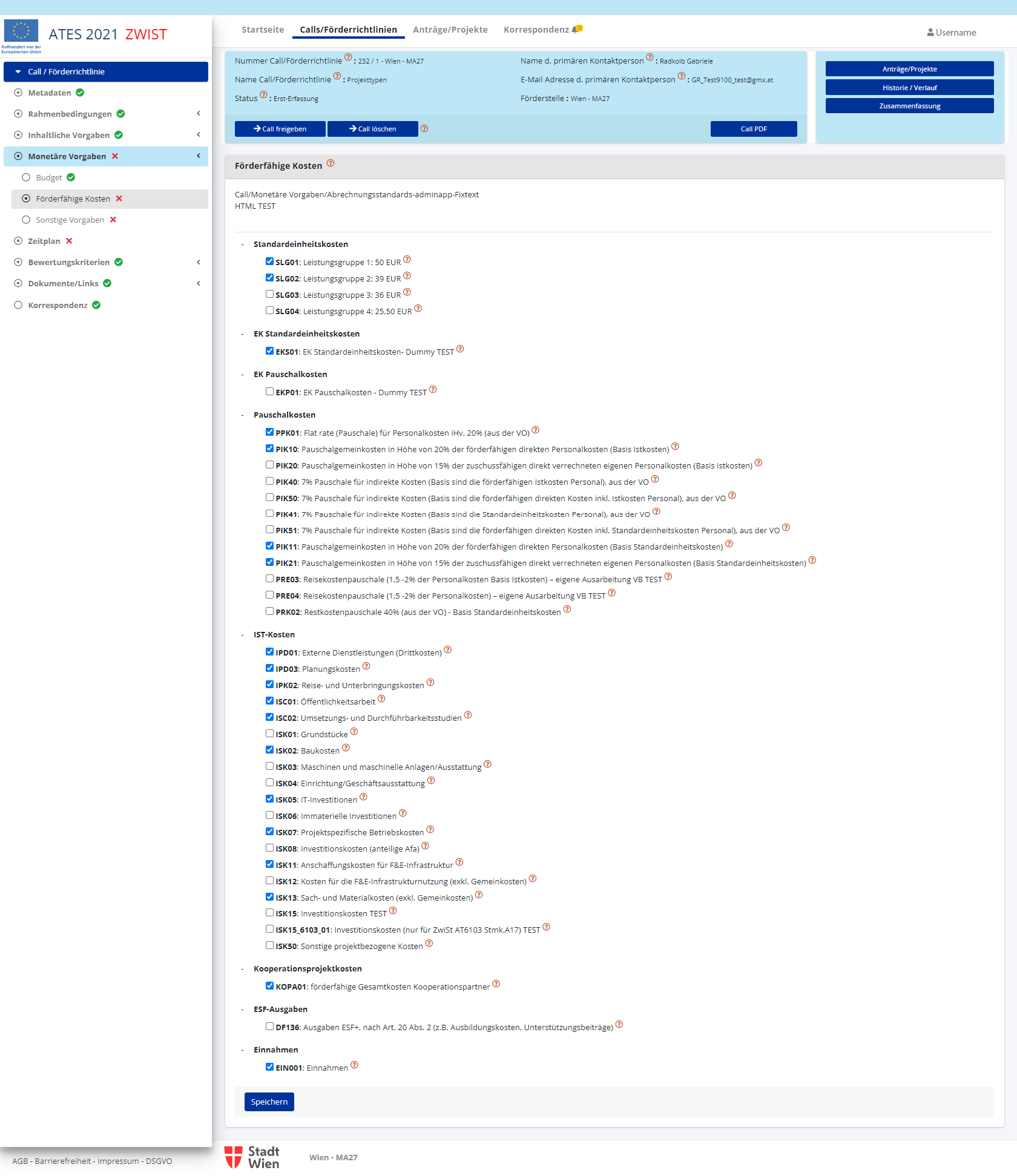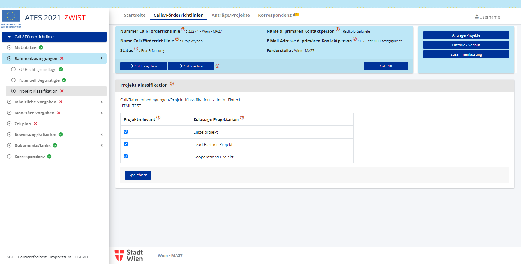 Nach dem Speichern ist es möglich die den Call/die Förderrichtlinie einzurichten. Erledigte Punkte werden mit einem
