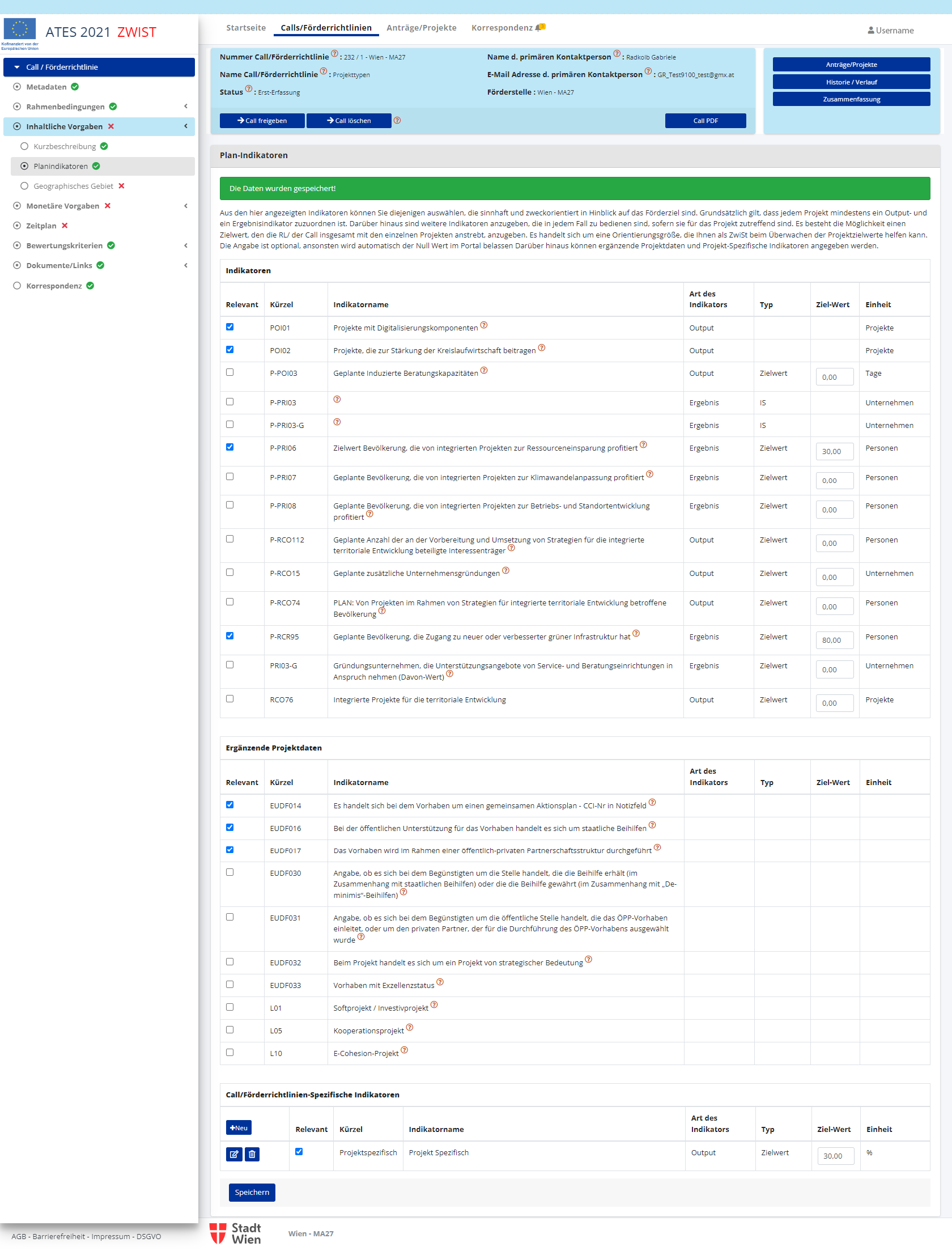 - Es können beliebig viele Call/Förderrichtlinien-Spezifische Indikatoren definiert werden: