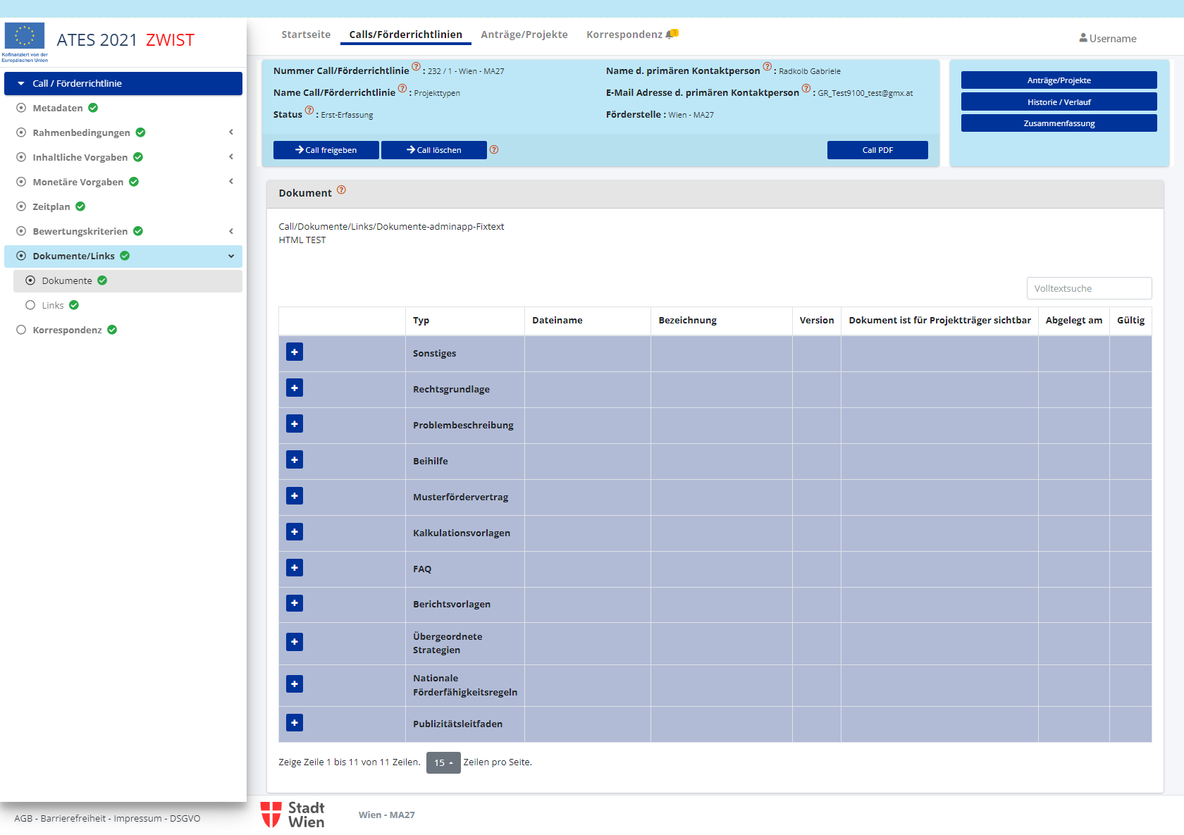 können in diesem Bereich neue Calls/Förderrichtlinien angelegt werden.